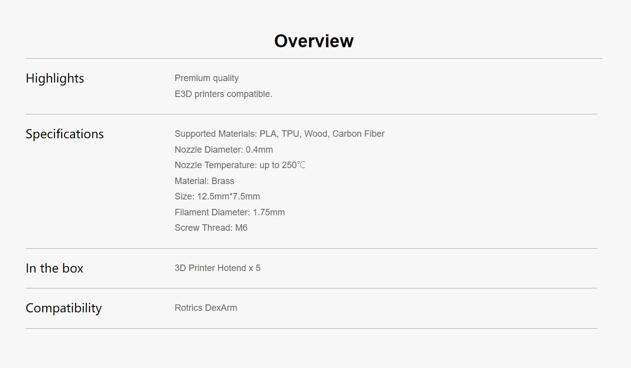 This 3D printer hotend is compatible with the DexArm 3D printing kit. Made of high-quality brass material, this hotend has a higher coefficient of thermal transmission, which provides you with stable filament output. With one-time forming technology, it is more durable and ensures a smoother 3D printing experience!