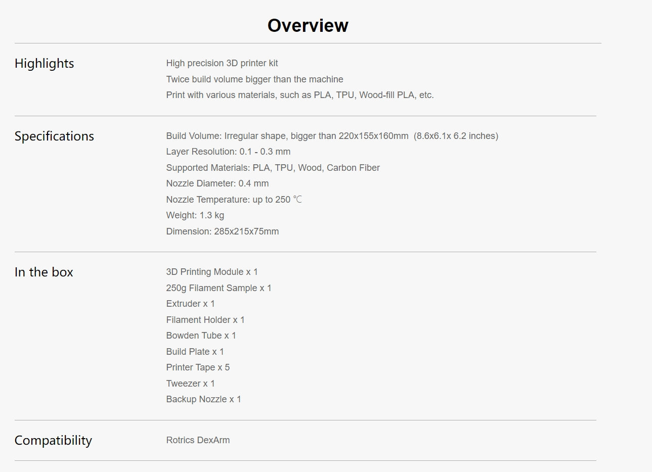 Rotrics 3D Printing Kit is a compact module to turn your desktop robotic arm into a high-precision 3D printer. With integrated structure design and 0.1mm high resolution, it provides a premium user experience and superior printing quality!