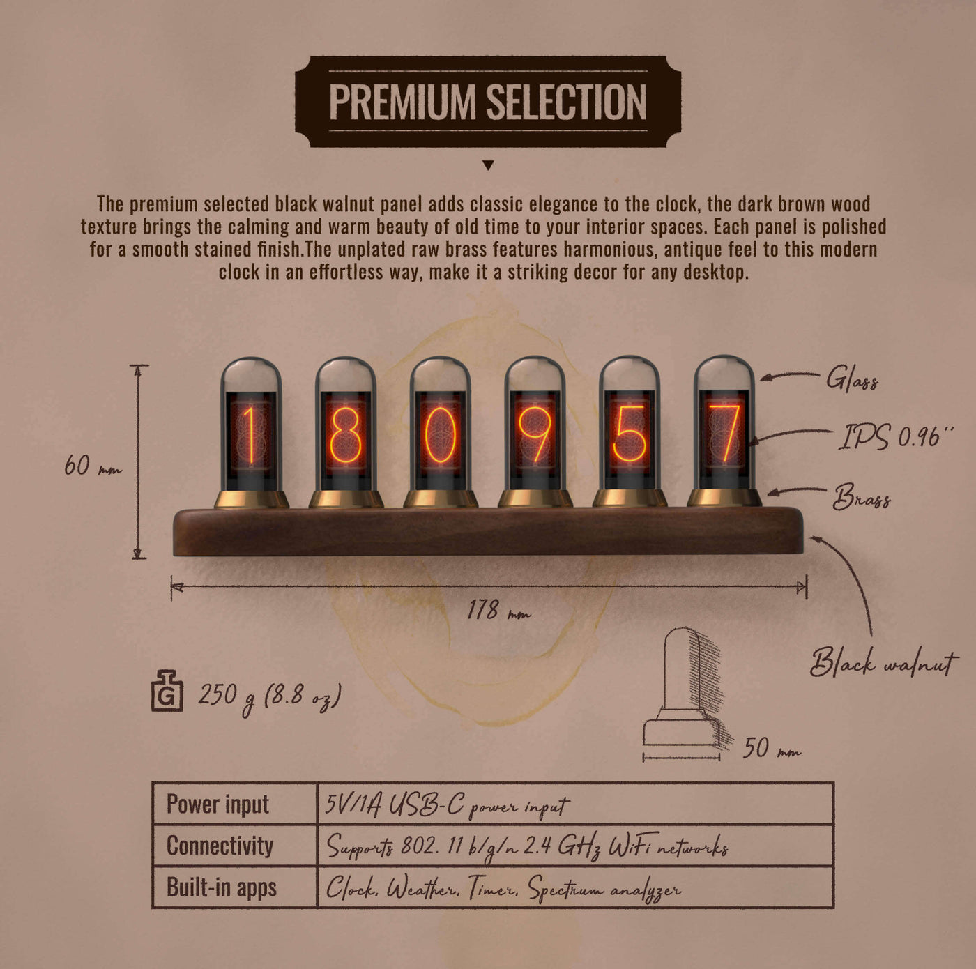 mid-1950s for numerals display. The bright warm orange glow has become a legendary symbol for the retro-tech. Nextube is using the modern IPS screens to revive the vintage beauty of nixie tubes. It's a charming mix of old and new times.